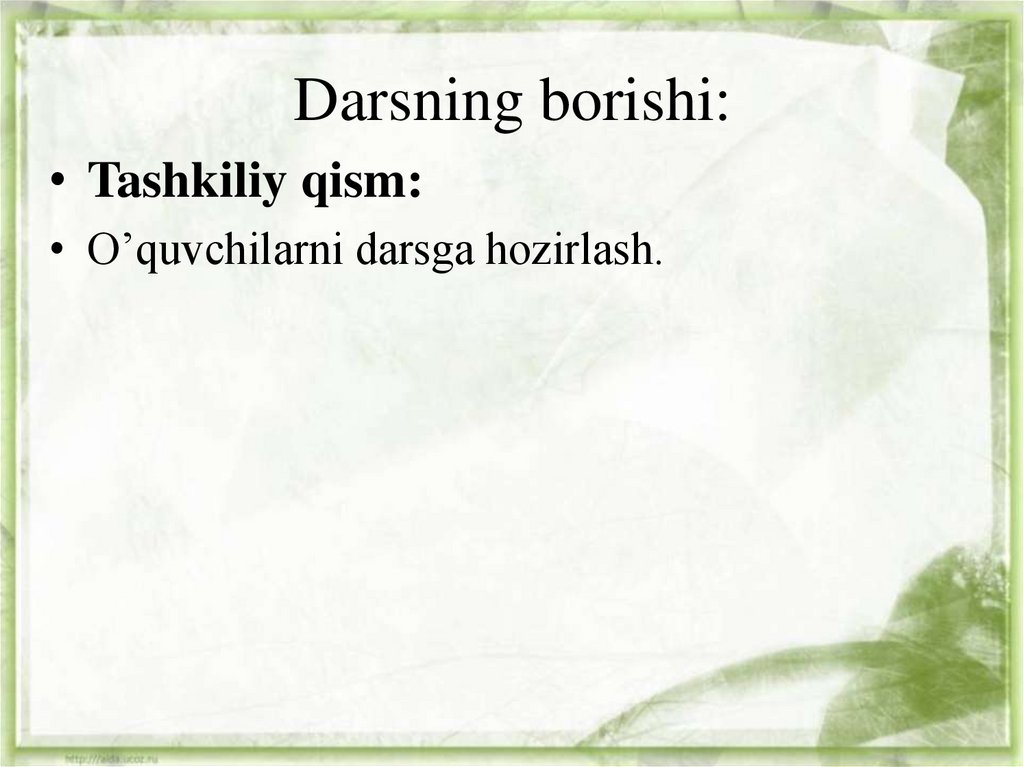• O’quvchilarni darsga hozirlash.