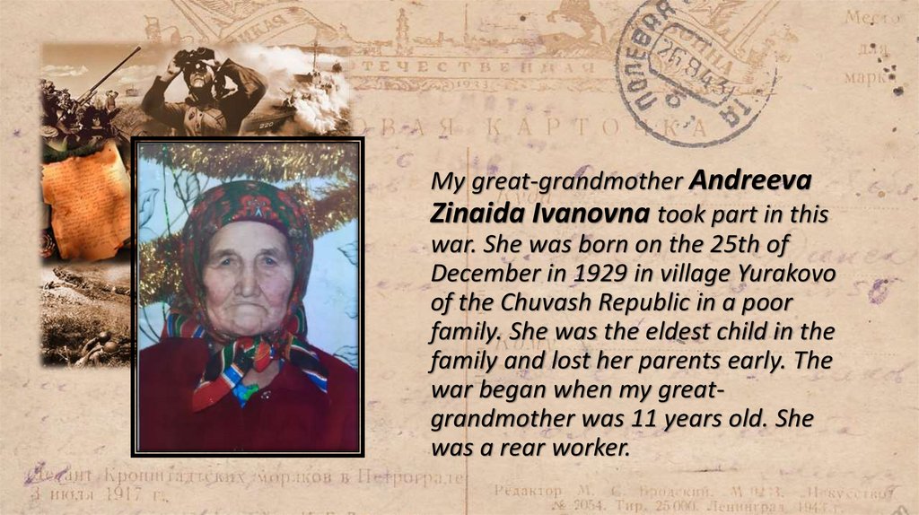 My great-grandmother AndreevaZinaida Ivanovna took part in this