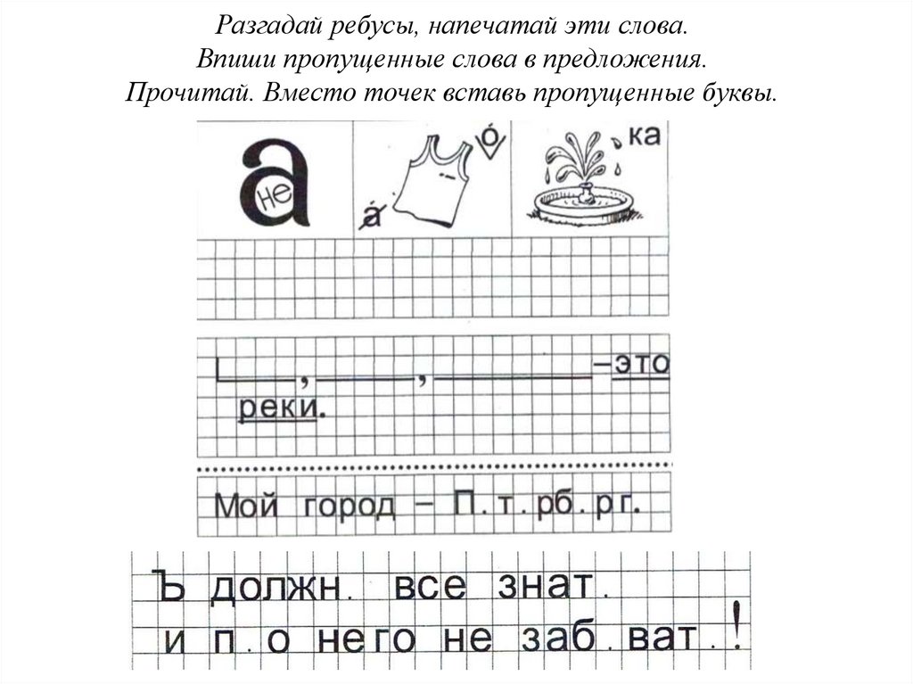 Разгадай ребусы, напечатай эти слова.Впиши пропущенные слова в предложения.