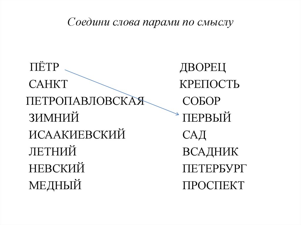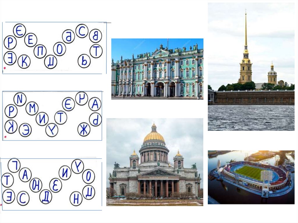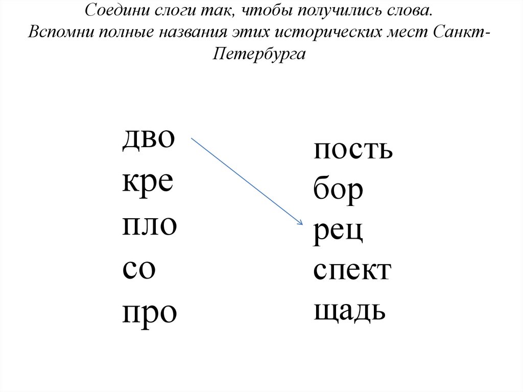 Соедини слоги так, чтобы получились слова.Вспомни полные названия этих исторических мест СанктПетербурга
