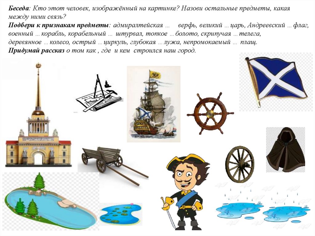 Подбери к признакам предметы: адмиралтейская … верфь, великий …царь, Андреевский …флаг,