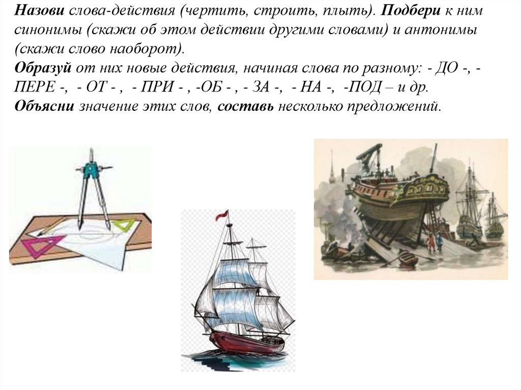 Назови слова-действия (чертить, строить, плыть). Подбери к нимсинонимы (скажи об этом действии другими словами) и антонимы