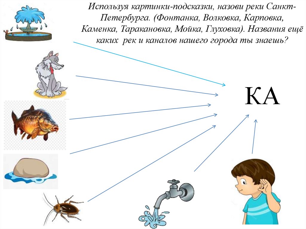 Используя картинки-подсказки, назови реки СанктПетербурга. (Фонтанка, Волковка, Карповка,Каменка, Таракановка, Мойка, Глуховка). Названия ещё