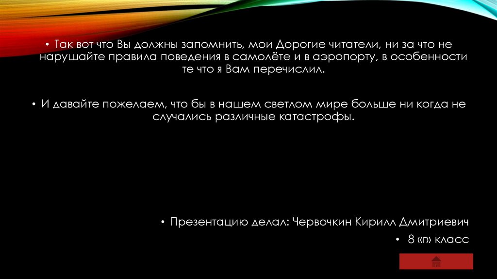 • Так вот что Вы должны запомнить, мои Дорогие читатели, ни за что ненарушайте правила поведения в самолёте и в аэропорту, в особенности