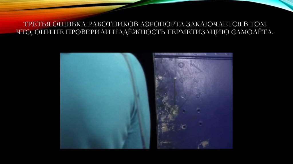 ТРЕТЬЯ ОШИБКА РАБОТНИКОВ АЭРОПОРТА ЗАКЛЮЧАЕТСЯ В ТОМЧТО, ОНИ НЕ ПРОВЕРИЛИ НАДЁЖНОСТЬ ГЕРМЕТИЗАЦИЮ САМОЛЁТА.