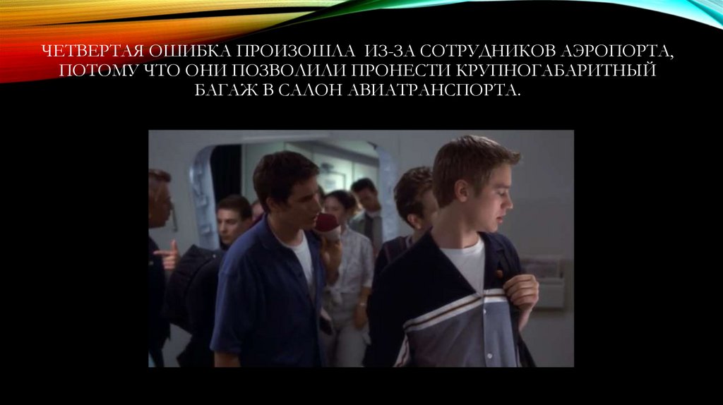 ЧЕТВЕРТАЯ ОШИБКА ПРОИЗОШЛА ИЗ-ЗА СОТРУДНИКОВ АЭРОПОРТА,ПОТОМУ ЧТО ОНИ ПОЗВОЛИЛИ ПРОНЕСТИ КРУПНОГАБАРИТНЫЙ
