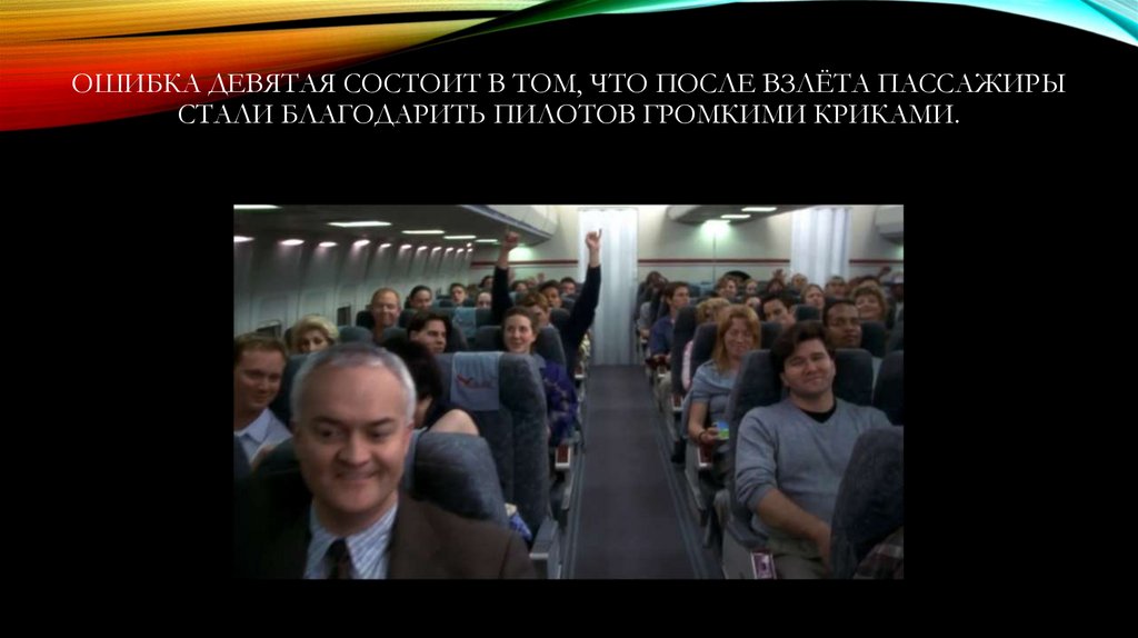 ОШИБКА ДЕВЯТАЯ СОСТОИТ В ТОМ, ЧТО ПОСЛЕ ВЗЛЁТА ПАССАЖИРЫСТАЛИ БЛАГОДАРИТЬ ПИЛОТОВ ГРОМКИМИ КРИКАМИ.