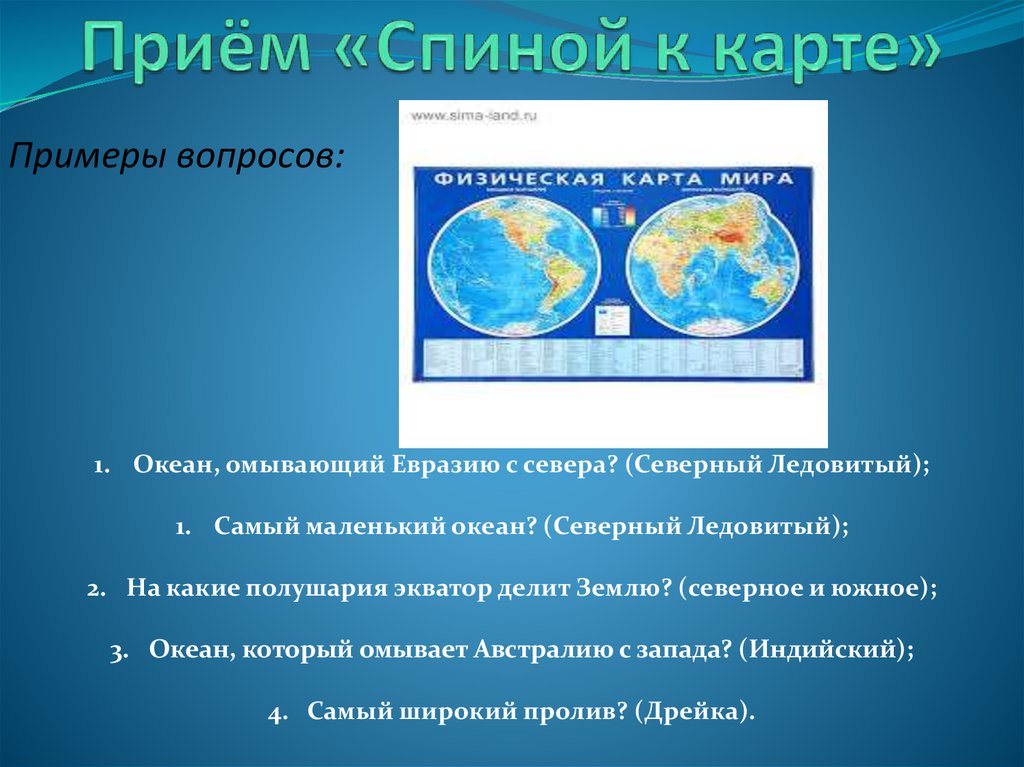 Примеры вопросов:1. Океан, омывающий Евразию с севера? (Северный Ледовитый);