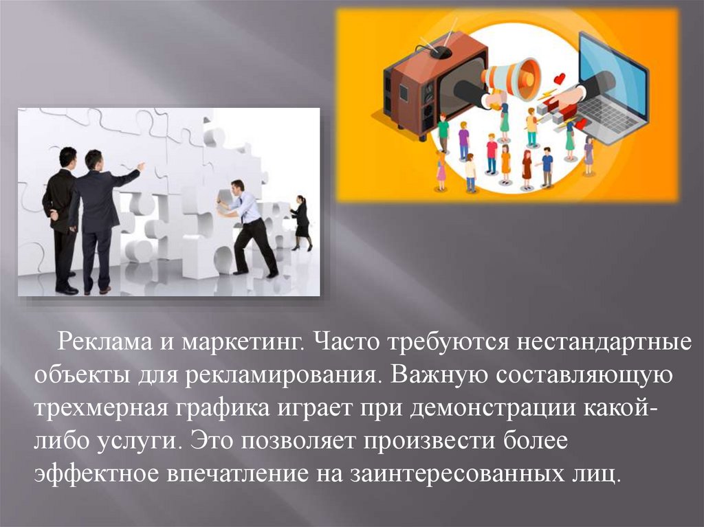 Реклама и маркетинг. Часто требуются нестандартныеобъекты для рекламирования. Важную составляющую