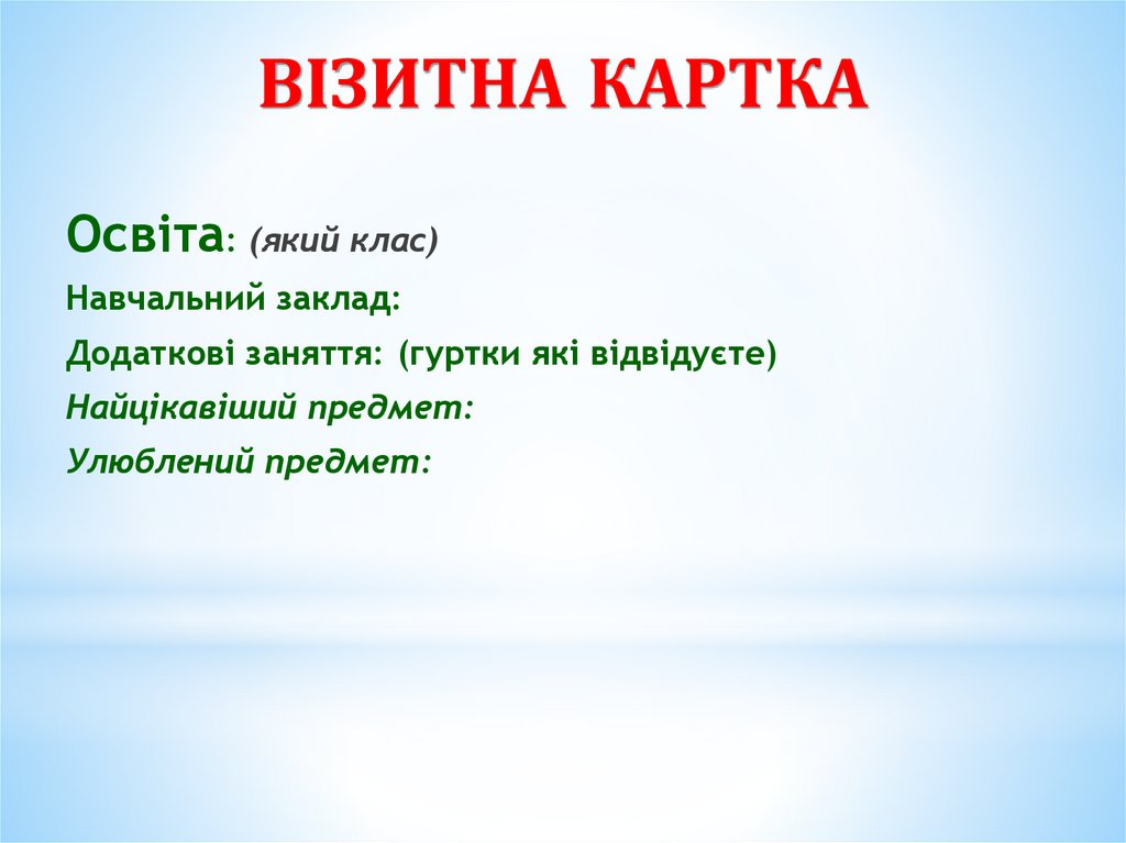 ВІЗИТНА КАРТКАОсвіта: (який клас)
