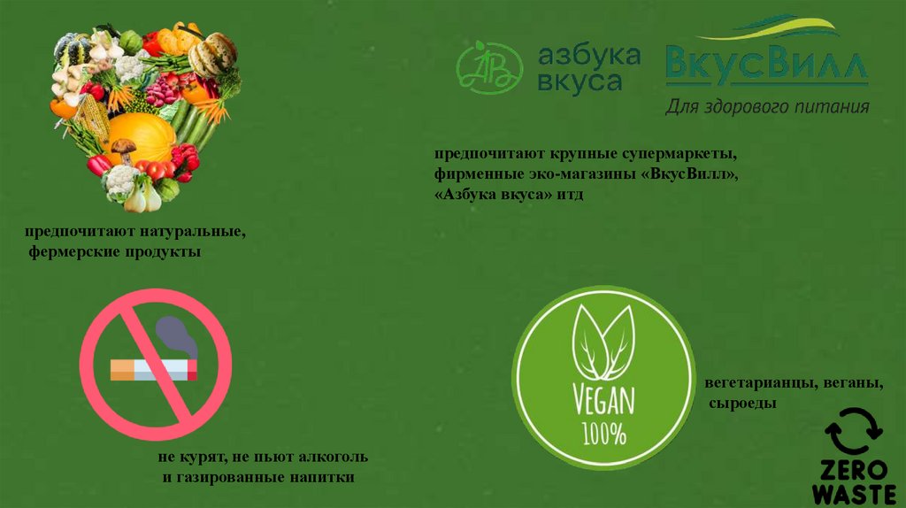 предпочитают крупные супермаркеты,фирменные эко-магазины «ВкусВилл»,