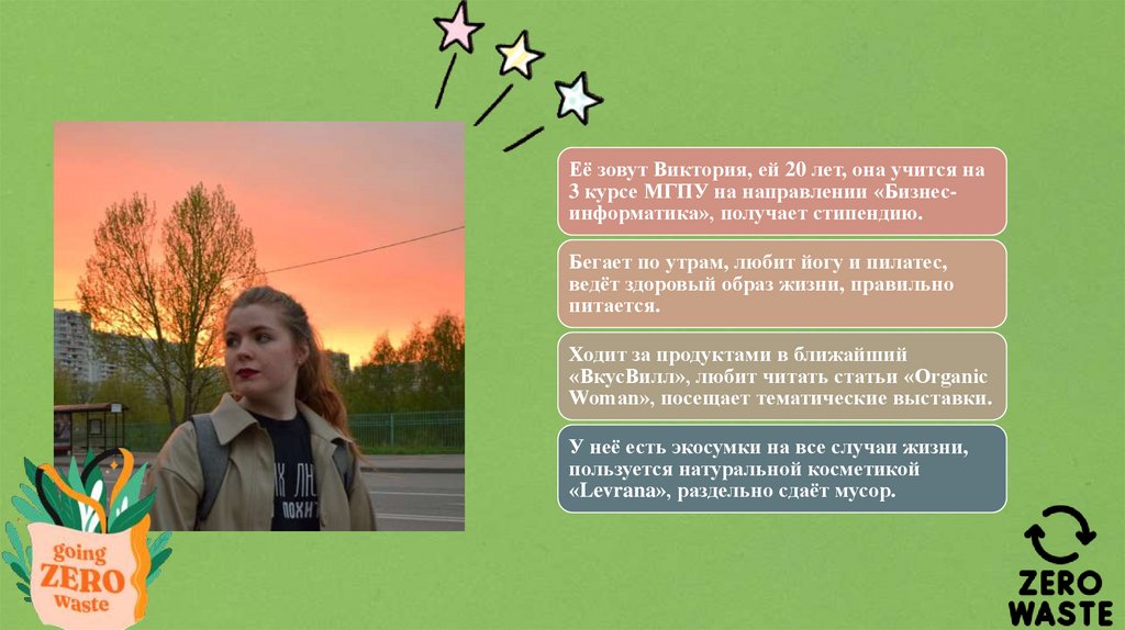 Её зовут Виктория, ей 20 лет, она учится на3 курсе МГПУ на направлении «Бизнесинформатика», получает стипендию.