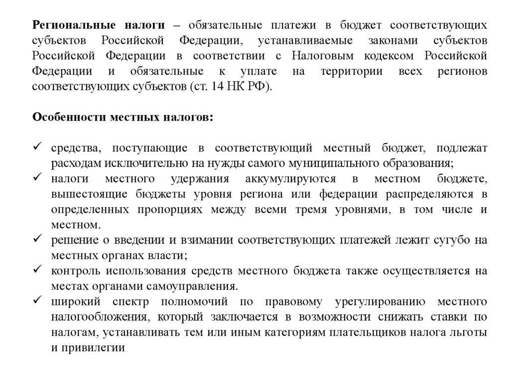 Региональные налоги – обязательные платежи в бюджет соответствующихсубъектов Российской Федерации, устанавливаемые законами субъектов