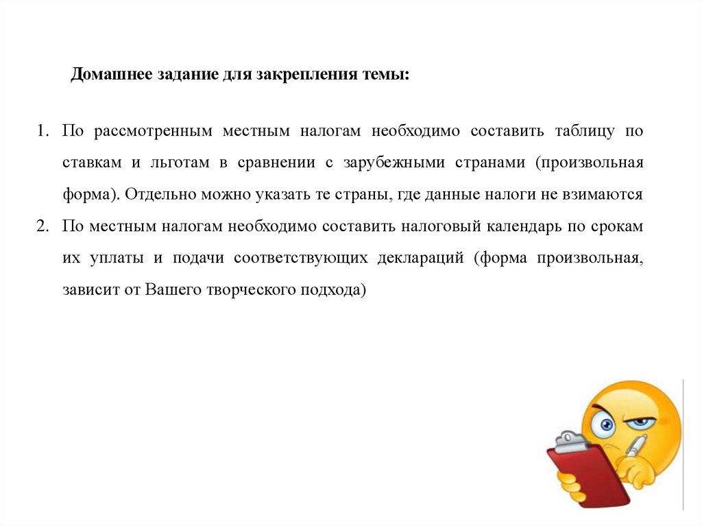 Домашнее задание для закрепления темы:1. По рассмотренным местным налогам необходимо составить таблицу по