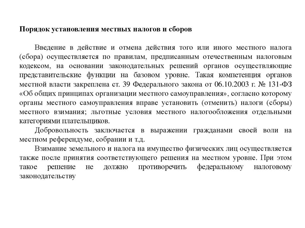 Порядок установления местных налогов и сборовВведение в действие и отмена действия того или иного местного налога
