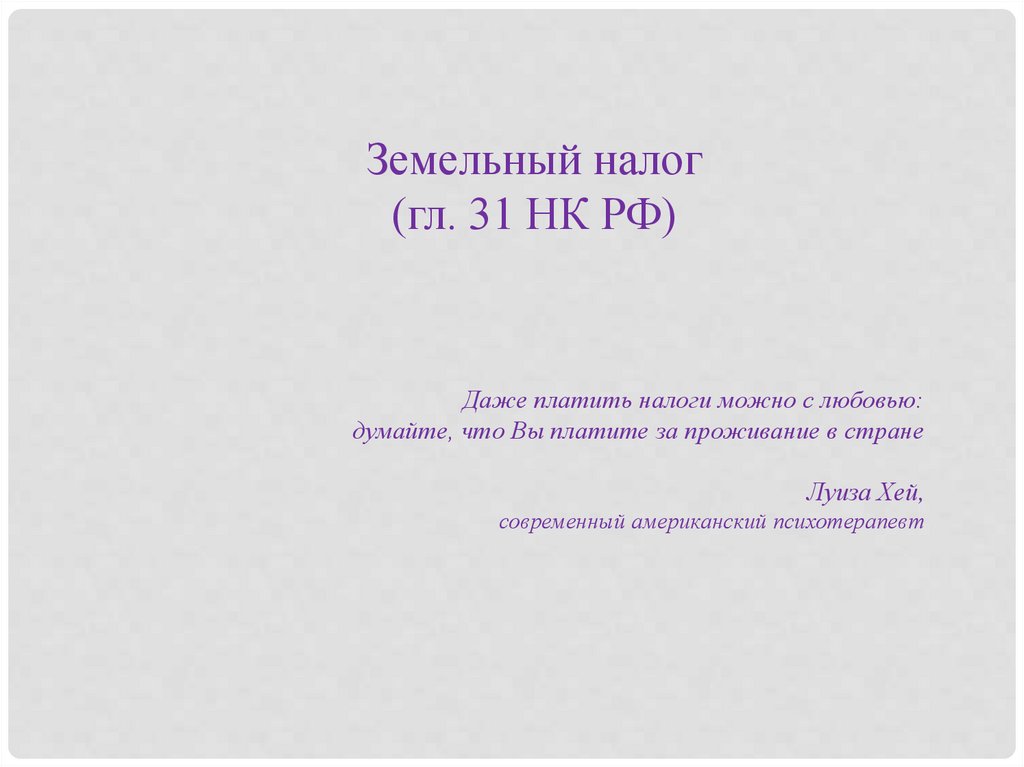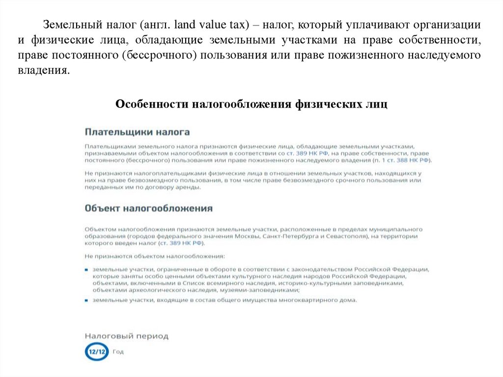 Земельный налог (англ. land value tax) – налог, который уплачивают организациии физические лица, обладающие земельными участками на праве собственности,