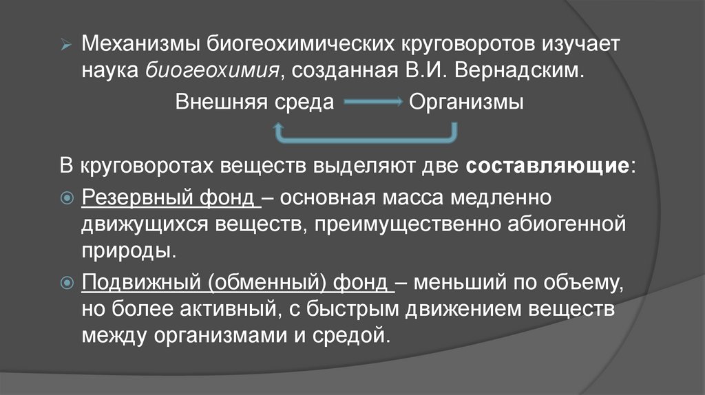 Механизмы биогеохимических круговоротов изучаетнаука биогеохимия, созданная В.И. Вернадским.