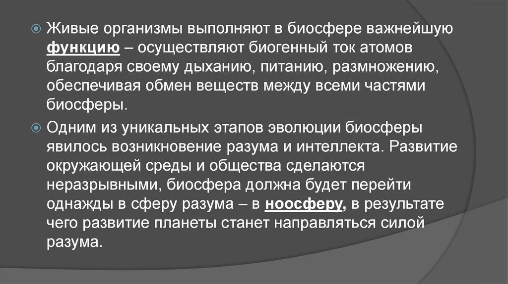 Живые организмы выполняют в биосфере важнейшуюфункцию – осуществляют биогенный ток атомов