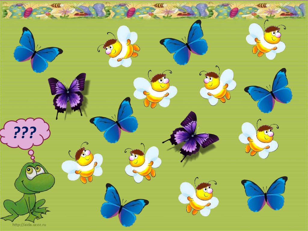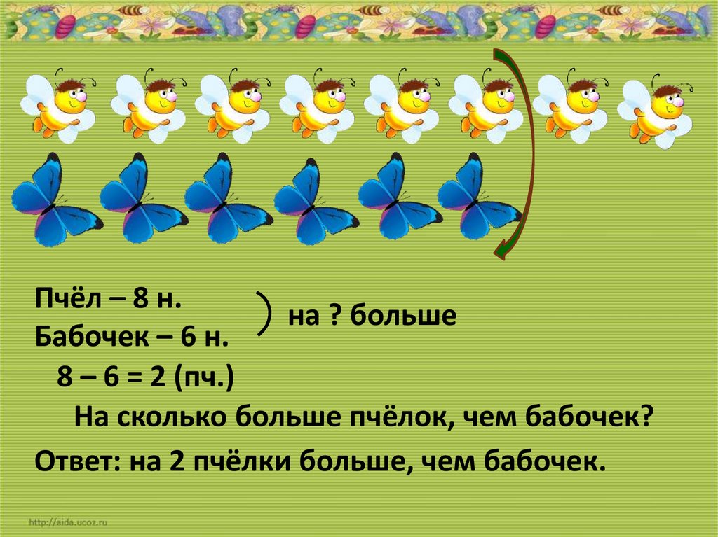 Ответ: на 2 пчёлки больше, чем бабочек.