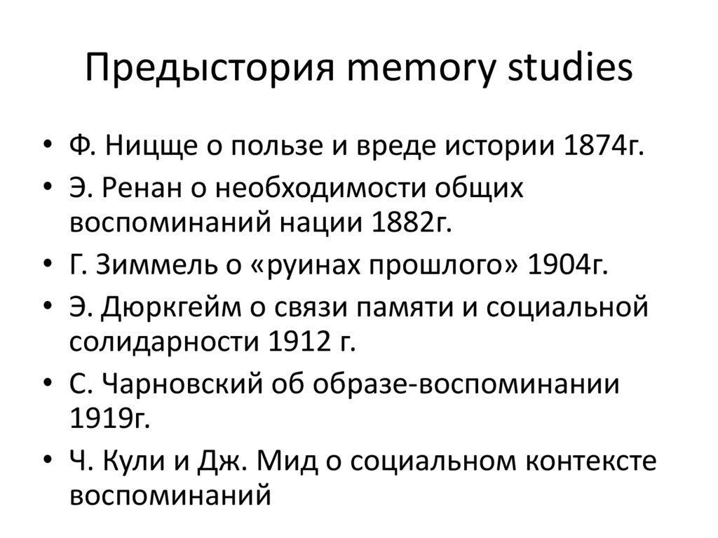 Предыстория memory studies• Ф. Ницще о пользе и вреде истории 1874г.