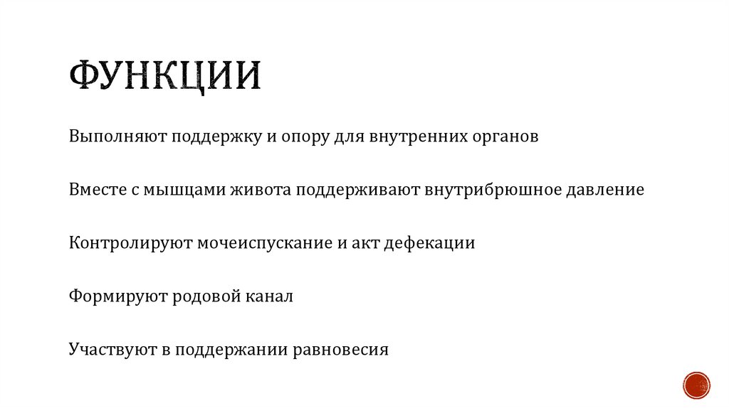 Выполняют поддержку и опору для внутренних органовВместе с мышцами живота поддерживают внутрибрюшное давление