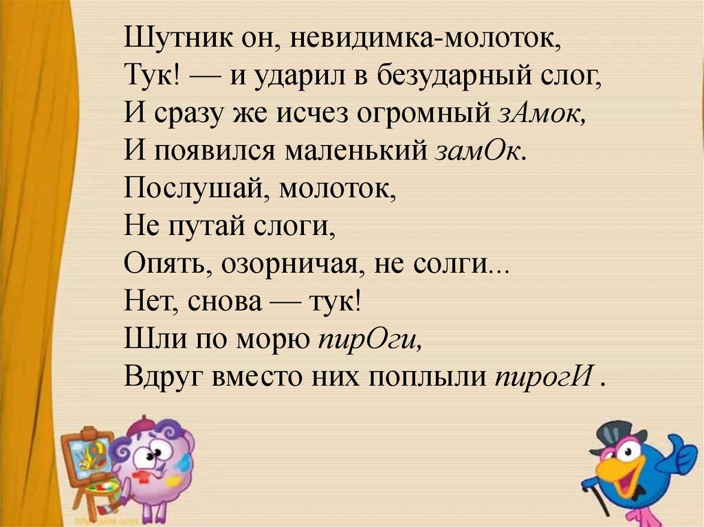 Шутник он, невидимка-молоток,Тук! — и ударил в безударный слог,