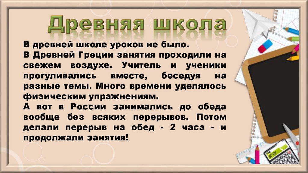 В древней школе уроков не было.В Древней Греции занятия проходили на