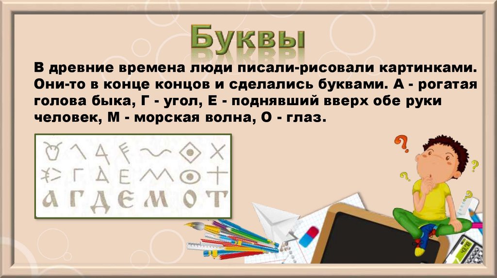 В древние времена люди писали-рисовали картинками.Они-то в конце концов и сделались буквами. А - рогатая