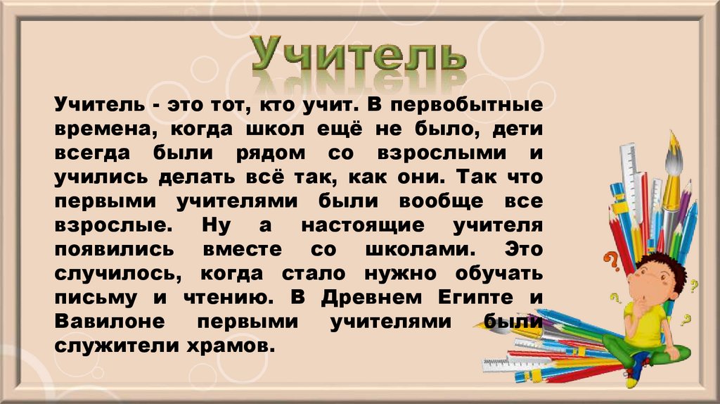 Учитель - это тот, кто учит. В первобытныевремена, когда школ ещё не было, дети