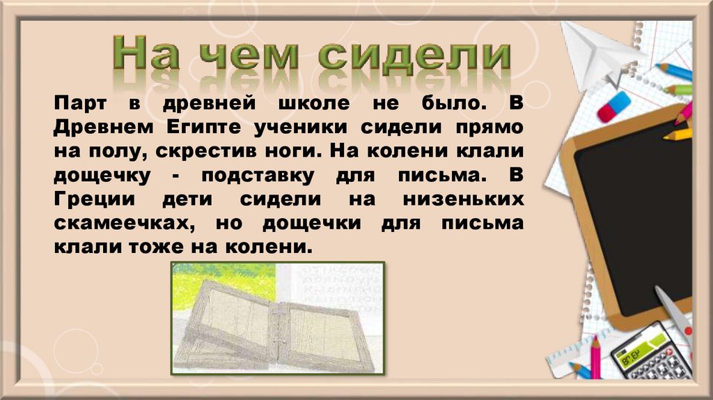 Парт в древней школе не было. ВДревнем Египте ученики сидели прямо