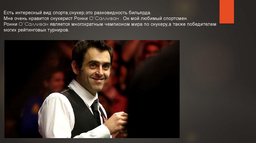 Есть интересный вид спорта,снукер,это разновидность бильярда.Мне очень нравится снукерист Ронни О’Салливан . Он мой любимый спортсмен.