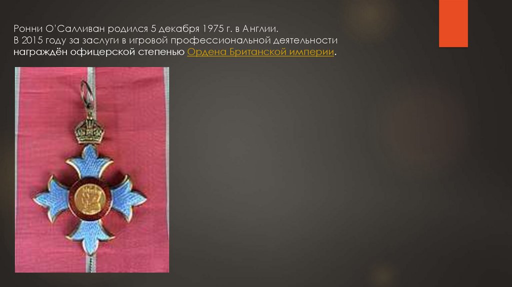 Ронни О’Салливан родился 5 декабря 1975 г. в Англии.В 2015 году за заслуги в игровой профессиональной деятельности