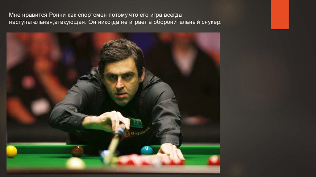 Мне нравится Ронни как спортсмен потому,что его игра всегданаступательная,атакующая. Он никогда не играет в оборонительный снукер.