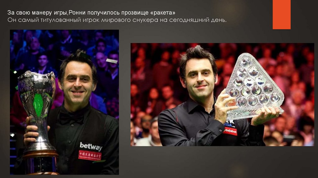 За свою манеру игры,Ронни получилось прозвище «ракета»Он самый титулованный игрок мирового снукера на сегодняшний день.