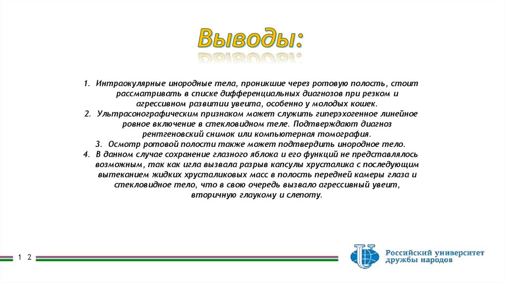1. Интраокулярные инородные тела, проникшие через ротовую полость, стоитрассматривать в списке дифференциальных диагнозов при резком и
