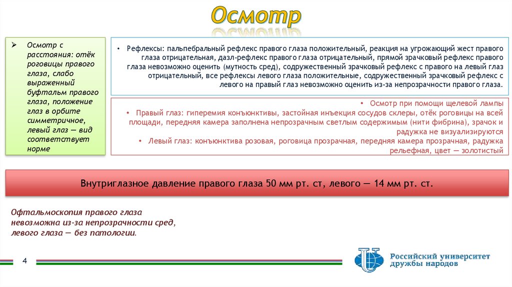 • Правый глаз: гиперемия конъюнктивы, застойная инъекция сосудов склеры, отёк роговицы на всей