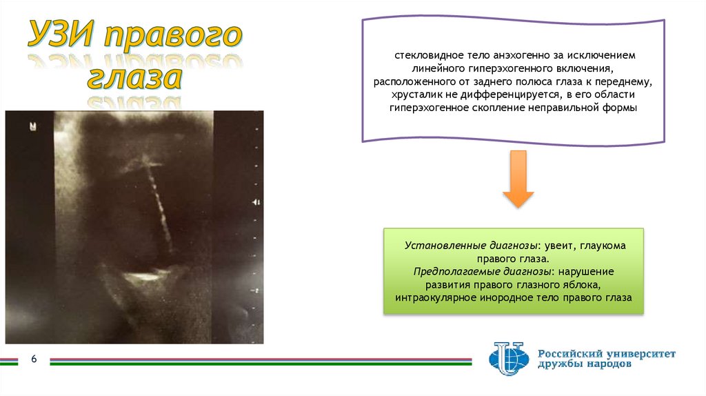 С использованием этих данных гиперэхогенное содержимое в областихрусталика было расценено как травматическая катаракта и как причина