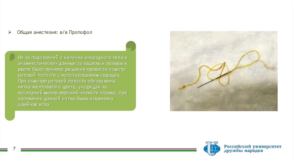 Общая анестезия: в/в ПропофолИз-за подозрений о наличии инородного тела и