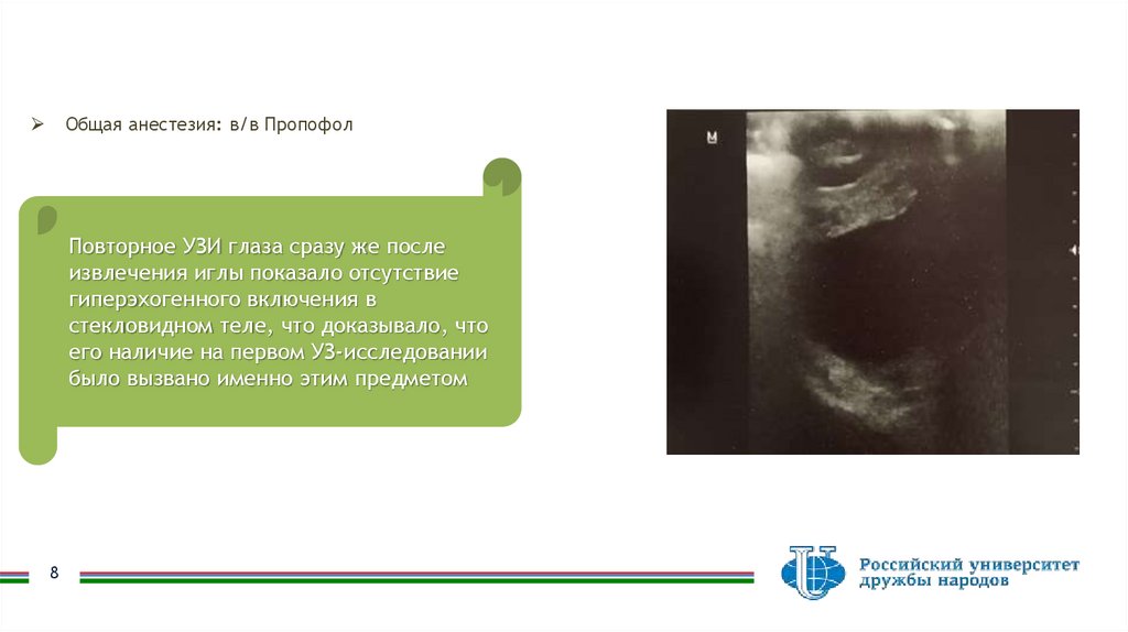 Общая анестезия: в/в ПропофолПовторное УЗИ глаза сразу же после