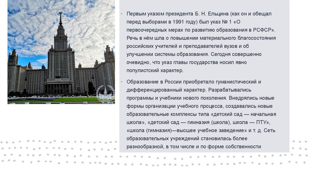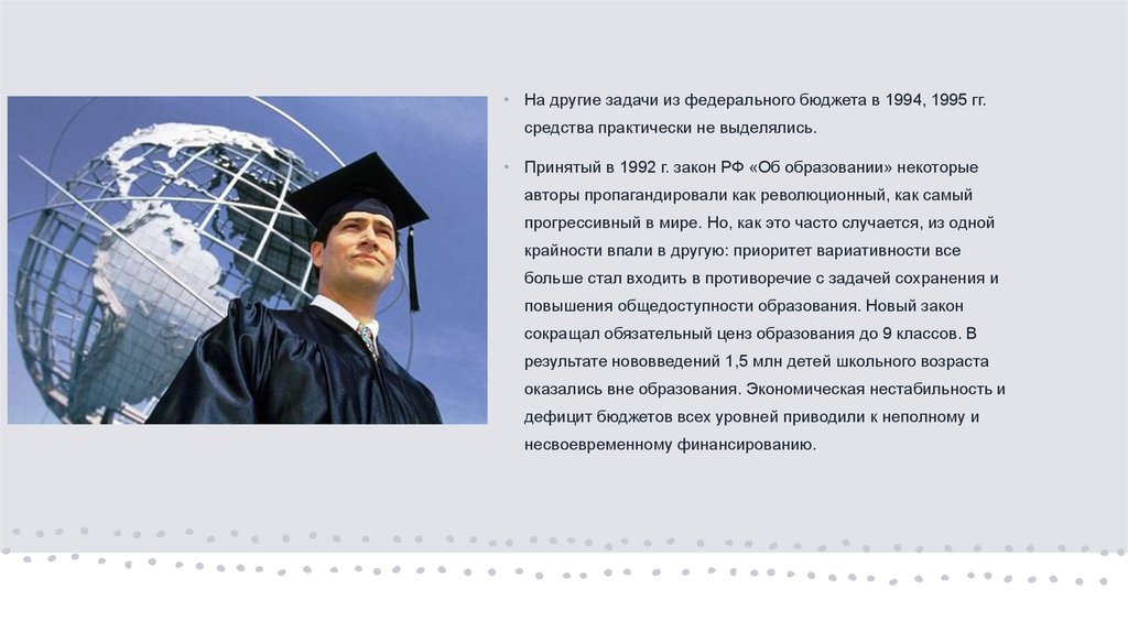 • Принятый в 1992 г. закон РФ «Об образовании» некоторые