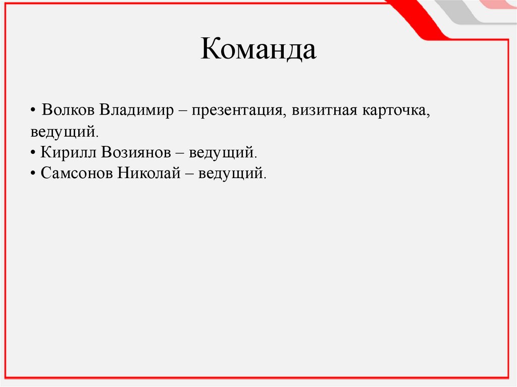 Команда• Волков Владимир – презентация, визитная карточка,