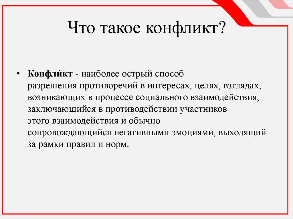 Что такое конфликт?• Конфли́кт - наиболее острый способ
