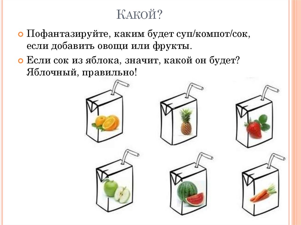 КАКОЙ?Пофантазируйте, каким будет суп/компот/сок,
