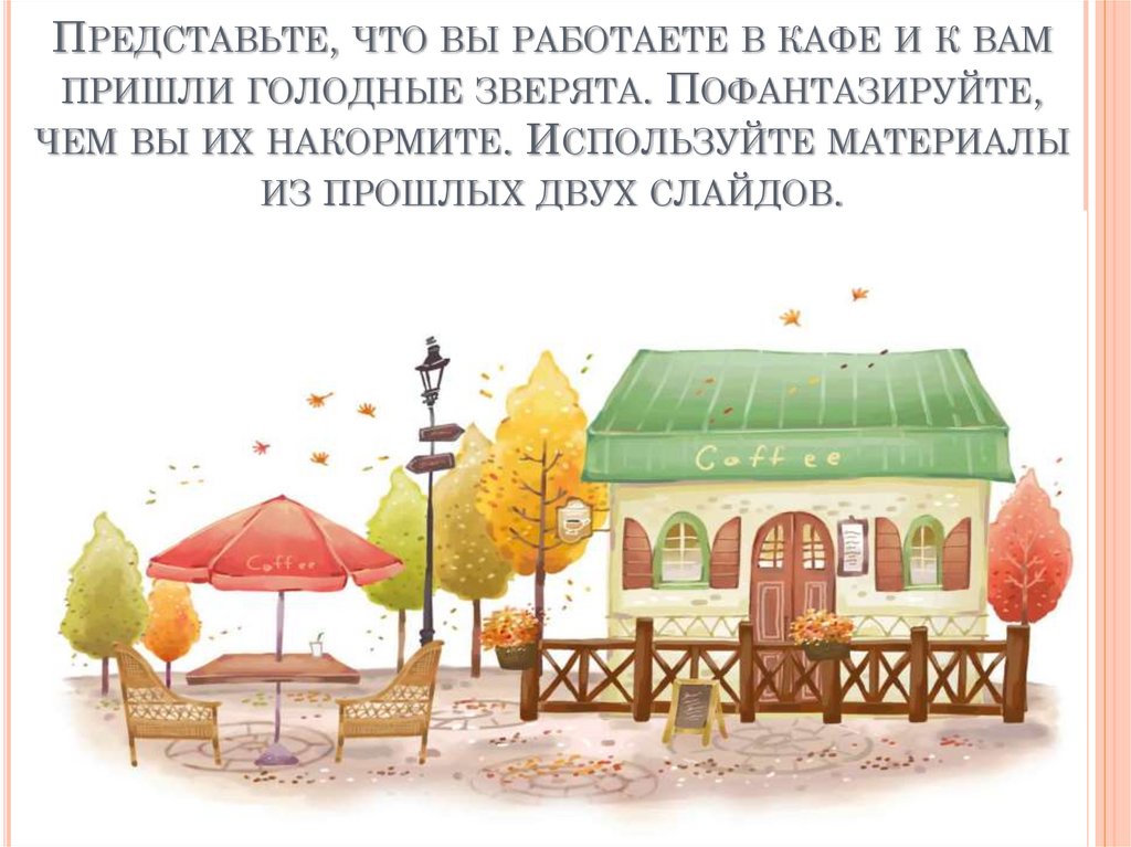 ПРЕДСТАВЬТЕ, ЧТО ВЫ РАБОТАЕТЕ В КАФЕ И К ВАМПРИШЛИ ГОЛОДНЫЕ ЗВЕРЯТА. ПОФАНТАЗИРУЙТЕ,