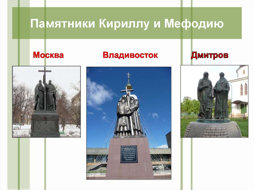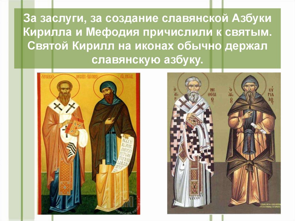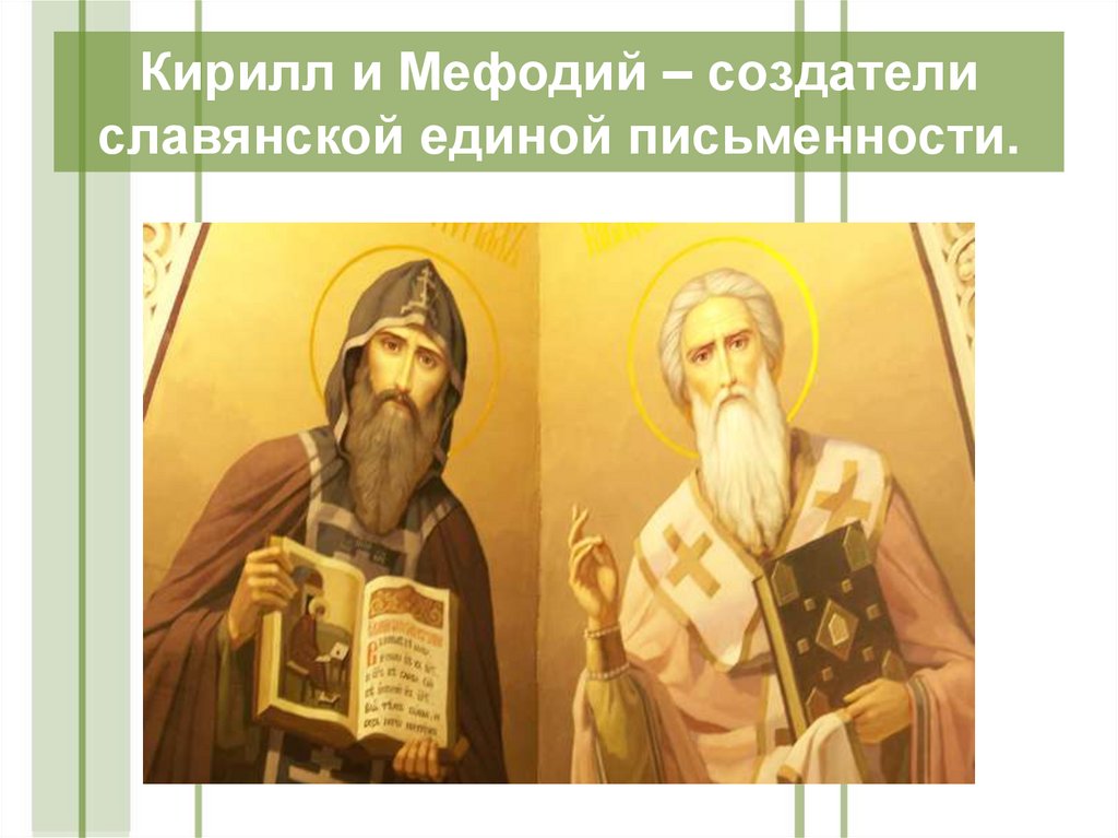 Кирилл и Мефодий – создателиславянской единой письменности.