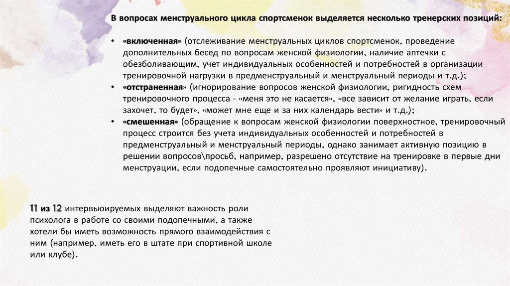 В вопросах менструального цикла спортсменок выделяется несколько тренерских позиций:• «включенная» (отслеживание менструальных циклов спортсменок, проведение