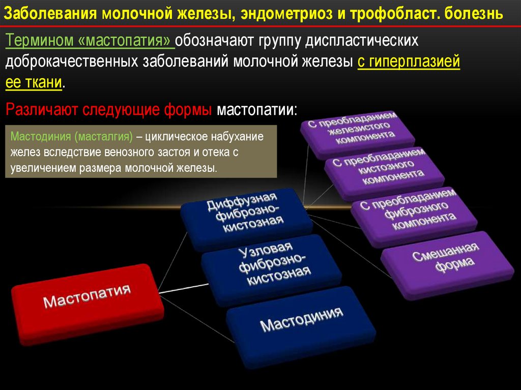 Заболевания молочной железы, эндометриоз и трофобласт. болезньТермином «мастопатия» обозначают группу диспластических