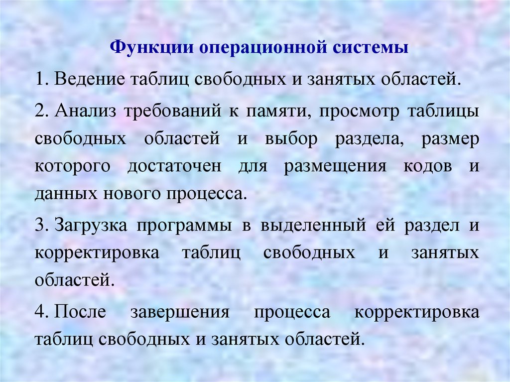 Функции операционной системы1. Ведение таблиц свободных и занятых областей.