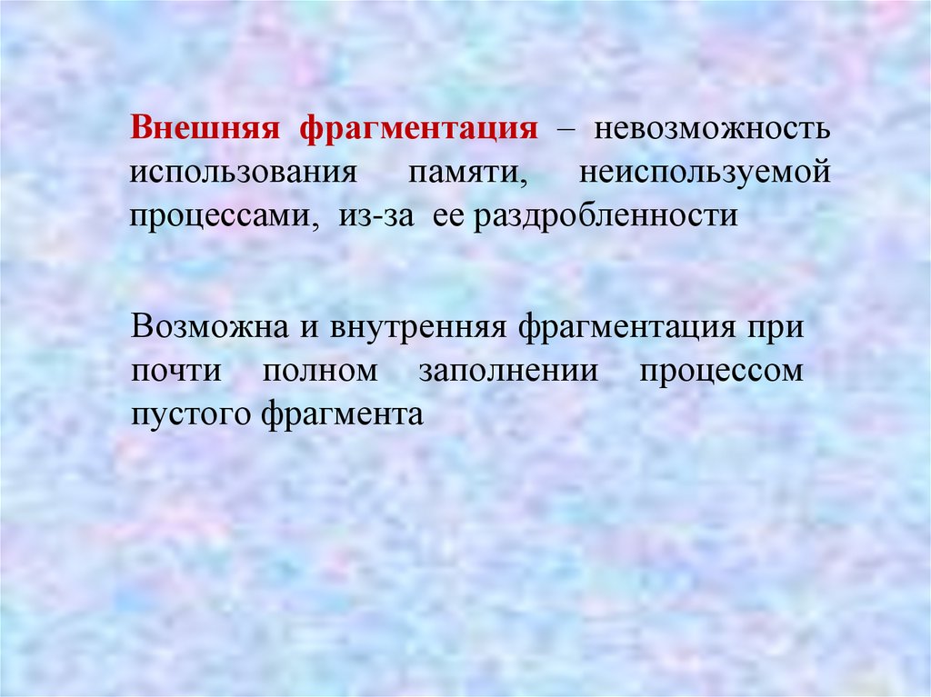 Внешняя фрагментация – невозможностьиспользования памяти, неиспользуемой