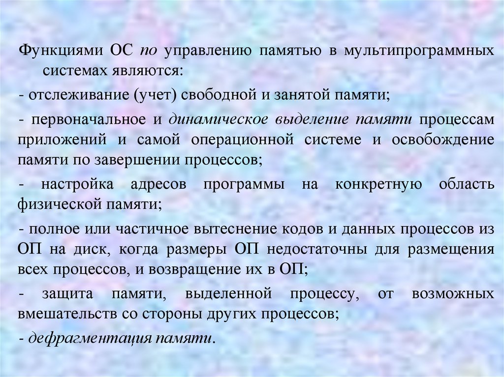 Функциями ОС по управлению памятью в мультипрограммныхсистемах являются: